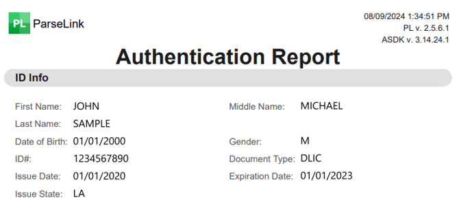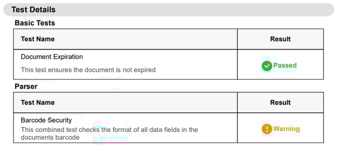 Each test is broken out into different categories and listed in the same order as they appear in the Authentication Results popup. There is a description of each test along with the result of the test for this particular ID.