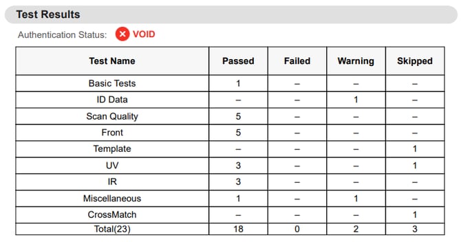 At the top of this section, there is an Authentication Status. This is the overall conclusion found by the Authentication Engine. Typically, and ID will give a value of Pass, Warning, Fail, Expired, or VOID, depending on the outcome of the tests.