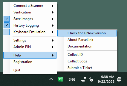 While you're using your computer, an update service will monitor for a new version of ParseLink and prepare it for you automatically. When the update is ready, a popup will appear that will restart the ParseLink application using the latest version from the IDScan.net server.