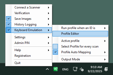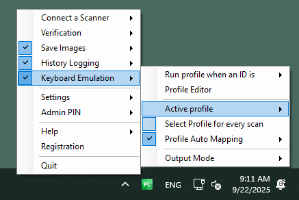 The profile you select will be used for every scan. To choose this profile right-click on the ParseLink icon to access the menu, navigate to Keyboard Emulation > Profiles, and then choose the profile you want from the list. Any custom profiles will be included here along with the default profiles.