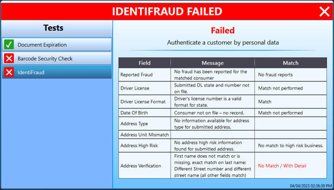 In the event of a failed IdentiFraud check, the popup will look like this: