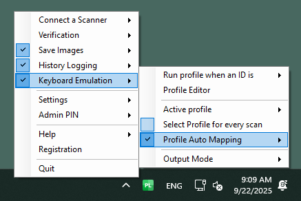 To configure profile auto mapping, access the Profiles Mapping Manager by right-clicking the ParseLink tray icon to access the main menu.