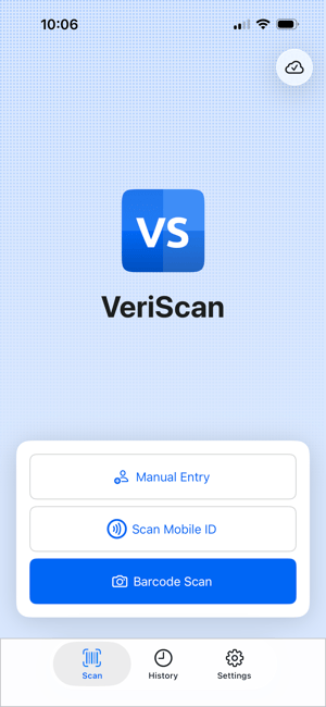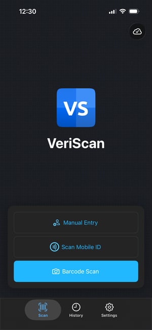 After signing in, launching the VeriScan app will bring you to this screen. 1. Online Status Indicator This cloud icon shows a ✓ when you're connected to the internet and your scans are syning to the VeriScan Cloud Portal. If you're not connected, or you're scanning offline, there will be an × in the cloud icon instead. Tapping this icon will manually switch you between online and offline modes and can be used to force resync your cloud setting. 2. ID Scanning Tapping these buttons allow you to capture your visitor's data and log them in your VeriScan Cloud history.