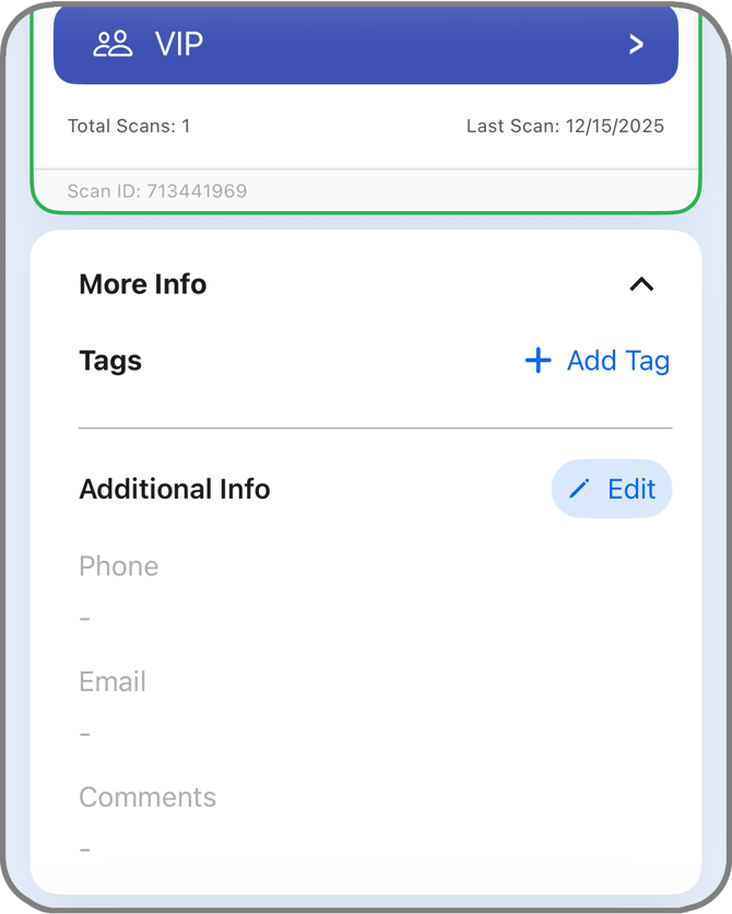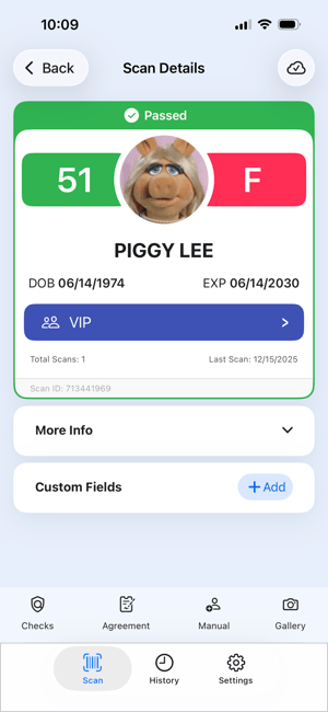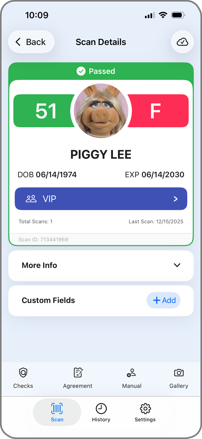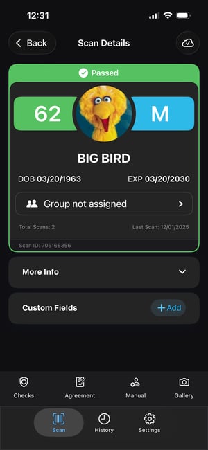 When you scan an ID, you will see the ID's details in the Scan Details screen. This screen appears automatically after a scan and shows the most important information at a glance.