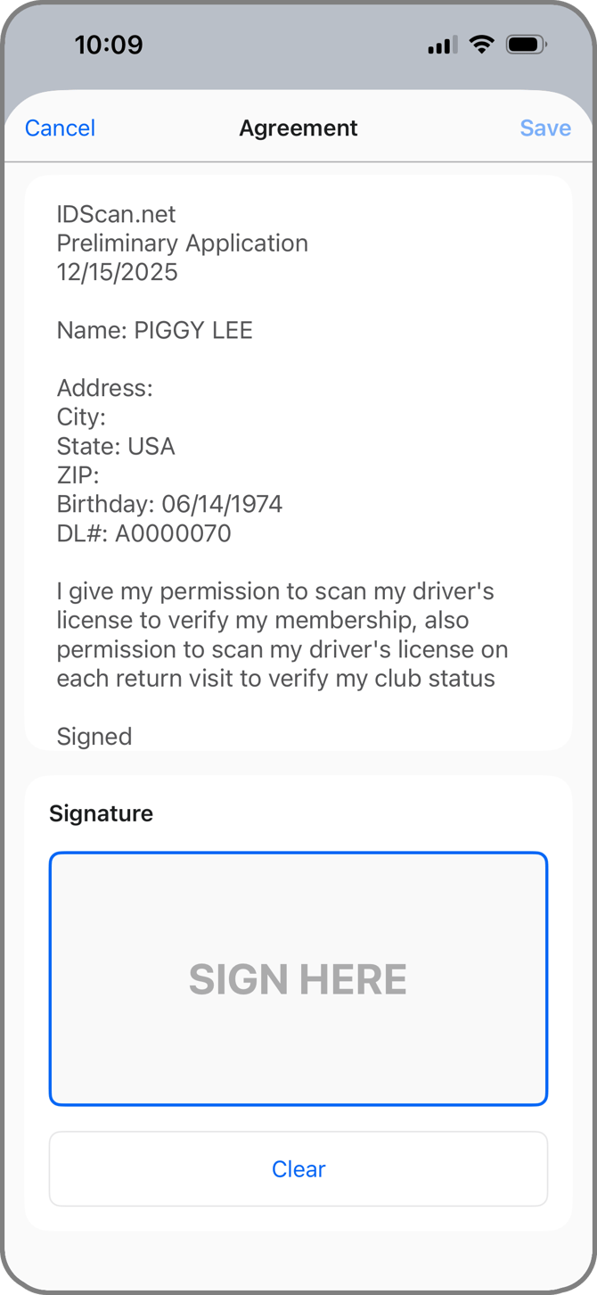 Agreements are configurable in the VeriScan portal and can be pre-populated with data captured by the scan. In the example on the right, you can see the scan date, name of the signer, address information (if listed), birthday, and driver's license number. You can add any additional hard coded text to the agreement that your visitor can scroll through, read, and sign. Tapping the Sign Here button opens a full screen signature capture screen where your visitor can sign with their finger. The agreement will be saved to the visitor's profile in the VeriScan portal and the signature and body of the agreement cannot be changed once signed. Any changes to the agreement require scanning the visitor's ID and tapping the Agreement button again so they can reread and resign the agreement. |