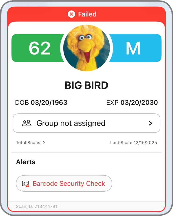 In the example on the right, you can see the status bar is red. In the alerts section below, you can see this is because the ID failed the Barcode Security Check. Any other alerts will appear in the alerts section as well, as configured in the VeriScan Cloud Portal.