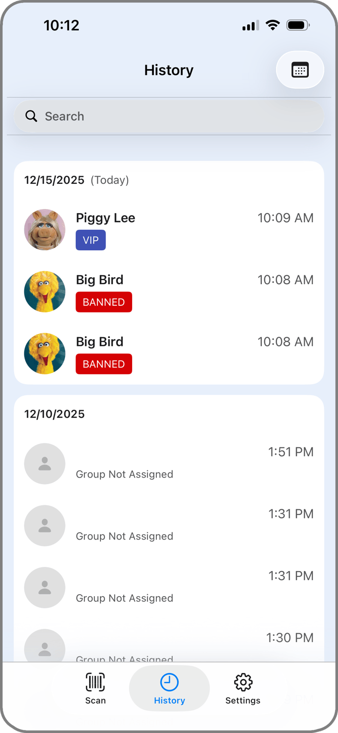 Tap the History icon in the navigation bar to open the recent history of scans on your account. This history menu acts as a quick reference for recent visitor and can be customized in the portal to show scans from just this device or all devices at your location. For more comprehensive filtering, log into the VeriScan Cloud portal to view your history. Date SelectorThe Calendar icon in the top right of the screen opens the date selector menu. You can select the start and end date to filter which history entries are shown in the list. SearchUse the search bar to search through the history entries for a visitor by name. Note that if a visit happened outside of the selected date range, it will not appear in the list even if you search for it. History EntriesHistory entries will appear in the list with key information. If a visitor is scanned via barcode or manual entry, you can see: